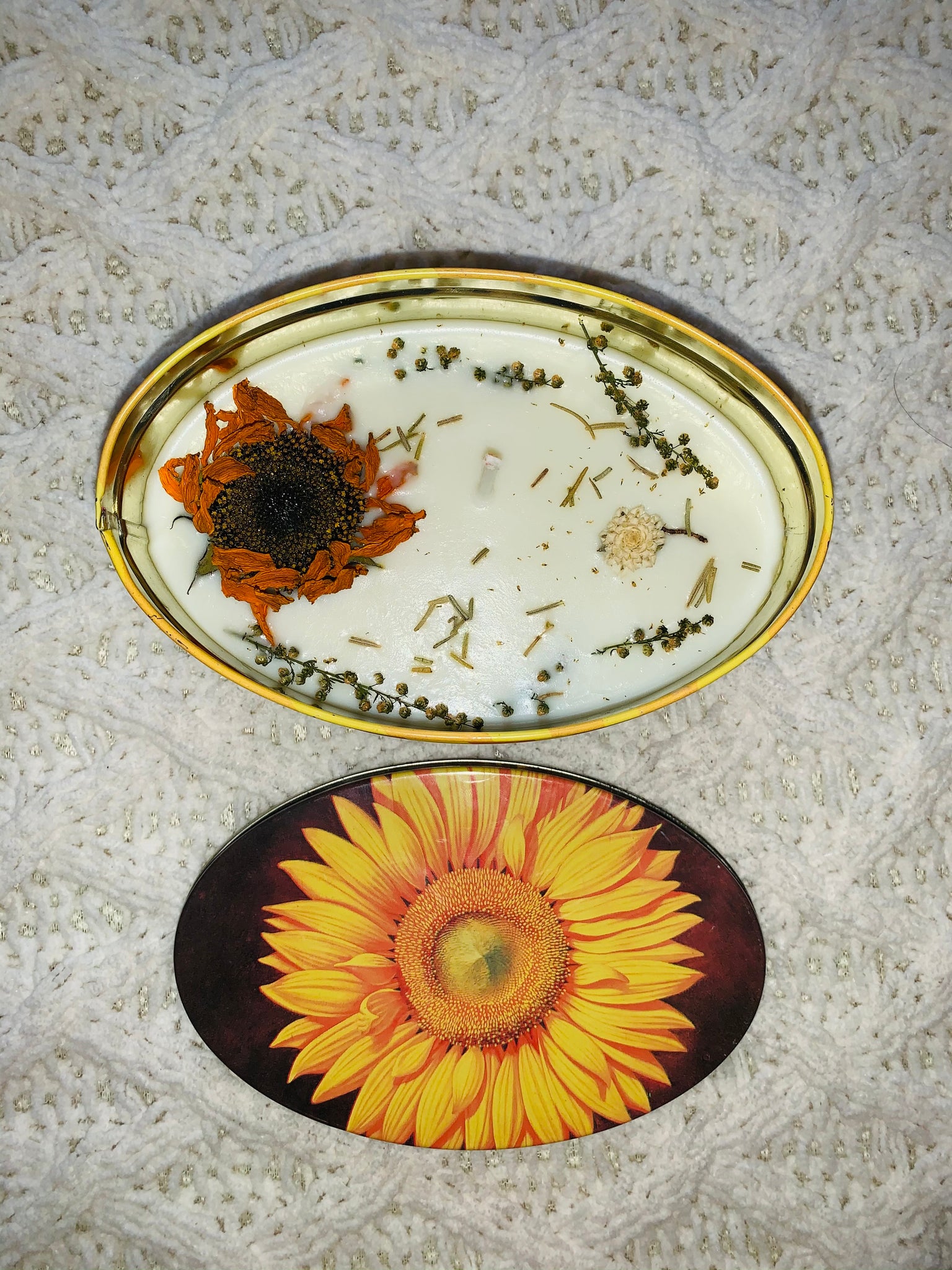 Relaxing sandalwood scented. This sunflower tin has actually been mine for a year or so. I got it and never knew what to put in it but it made the perfect candle with its own sunflower! 🌻