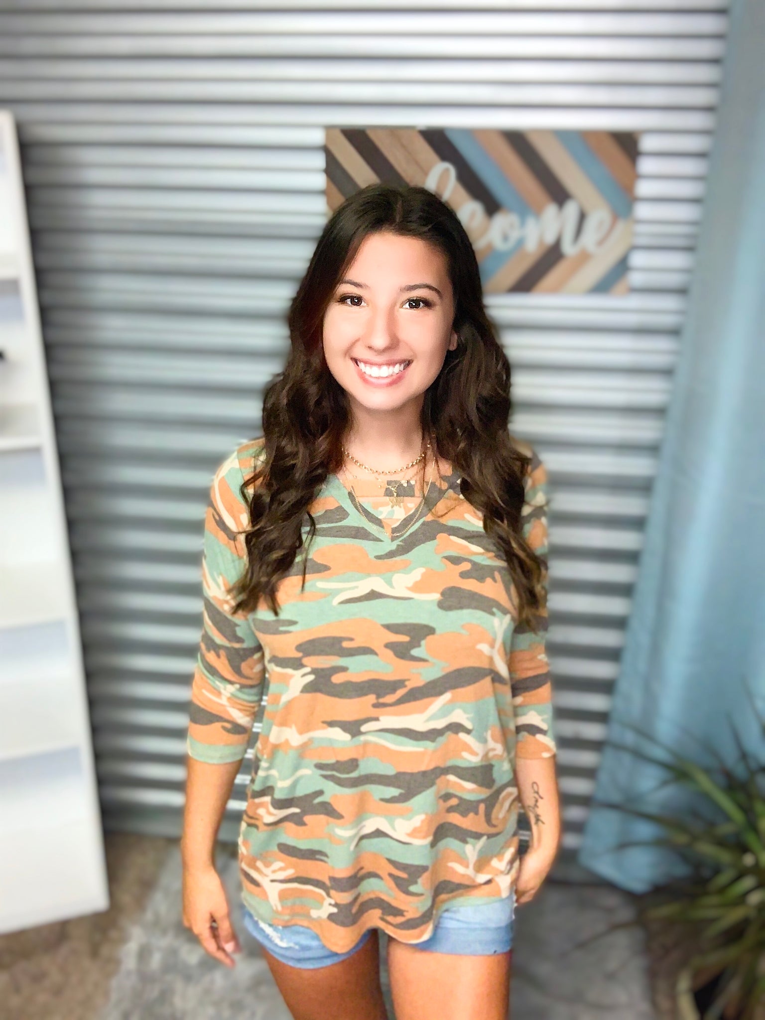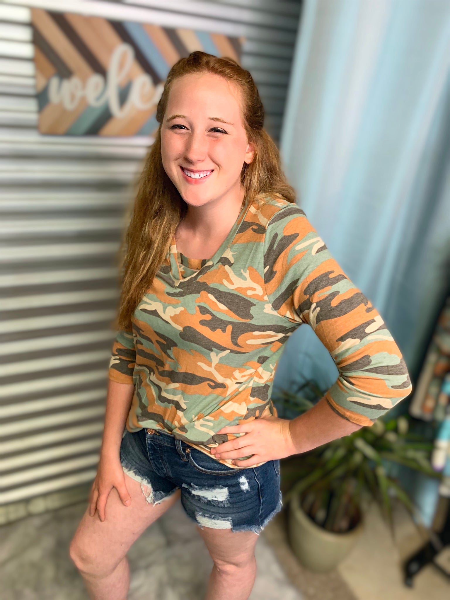 This ADORABLE light weight 3/4 sleeve Camo top is the perfect transition top for a cute summer to fall look.