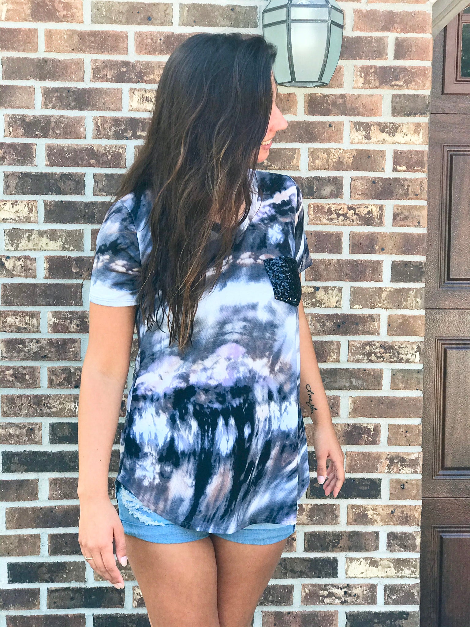 This beautiful tie dye top has cool, slinky to the touch fabric with a cute sequined pocket!