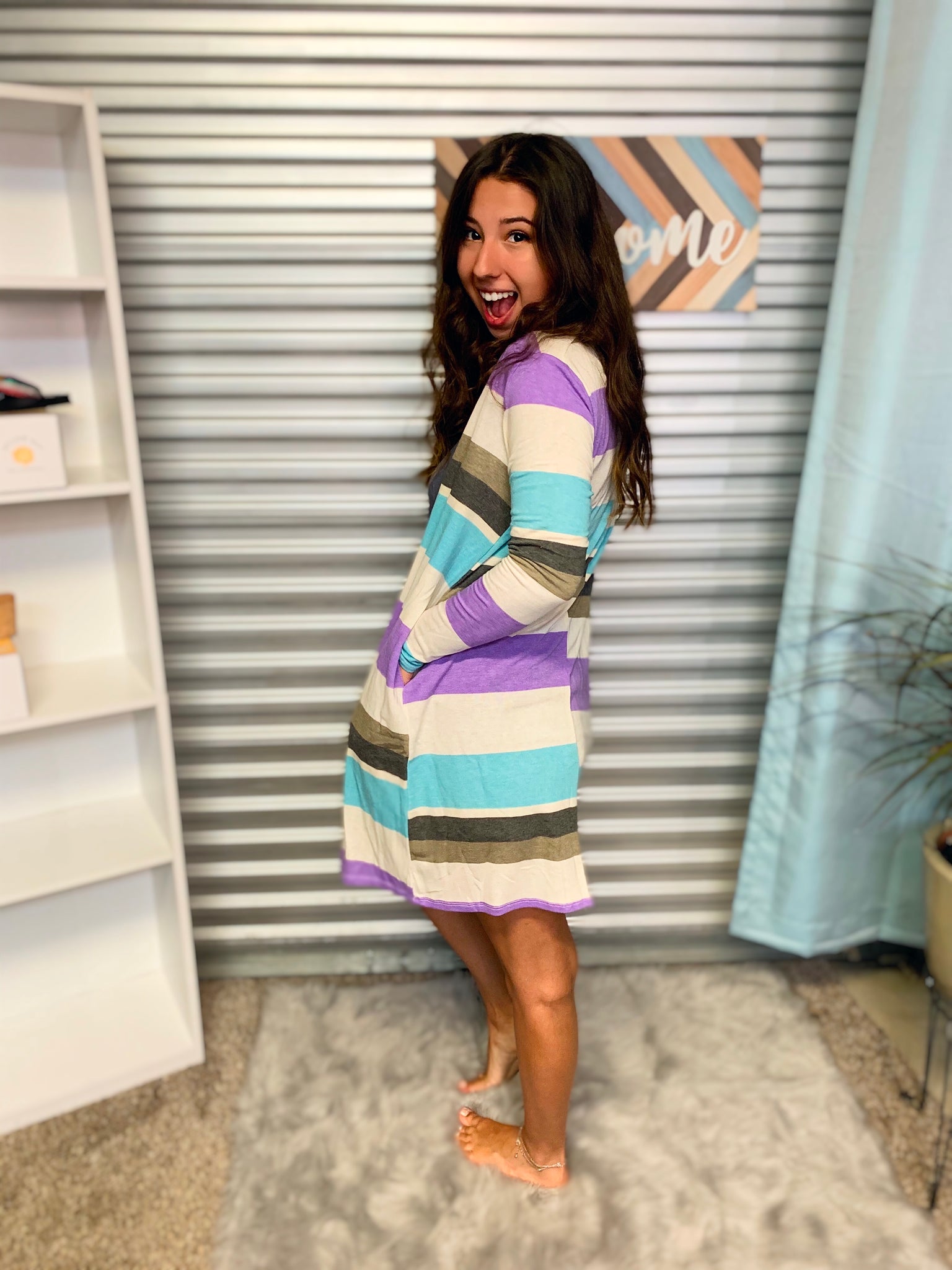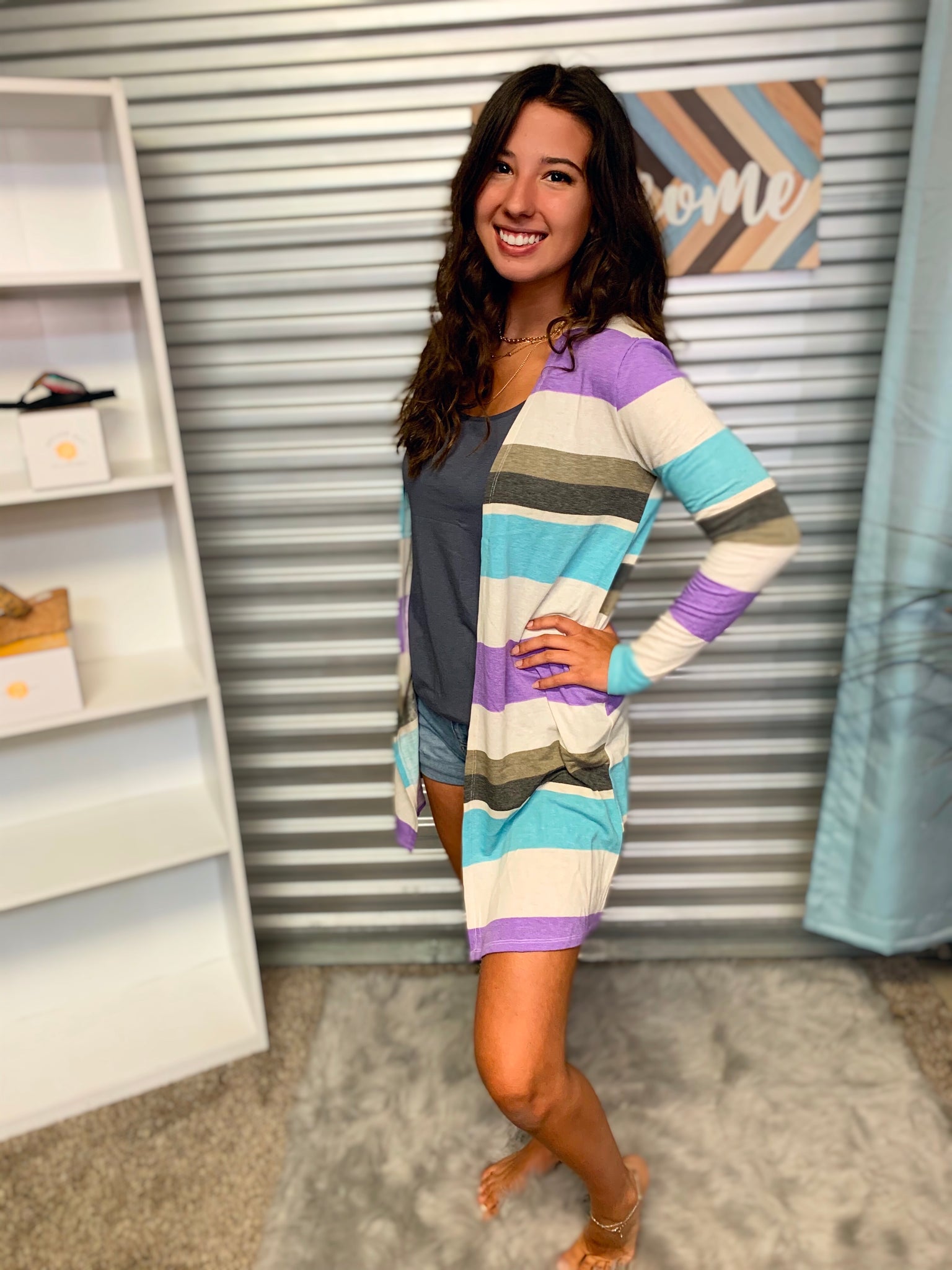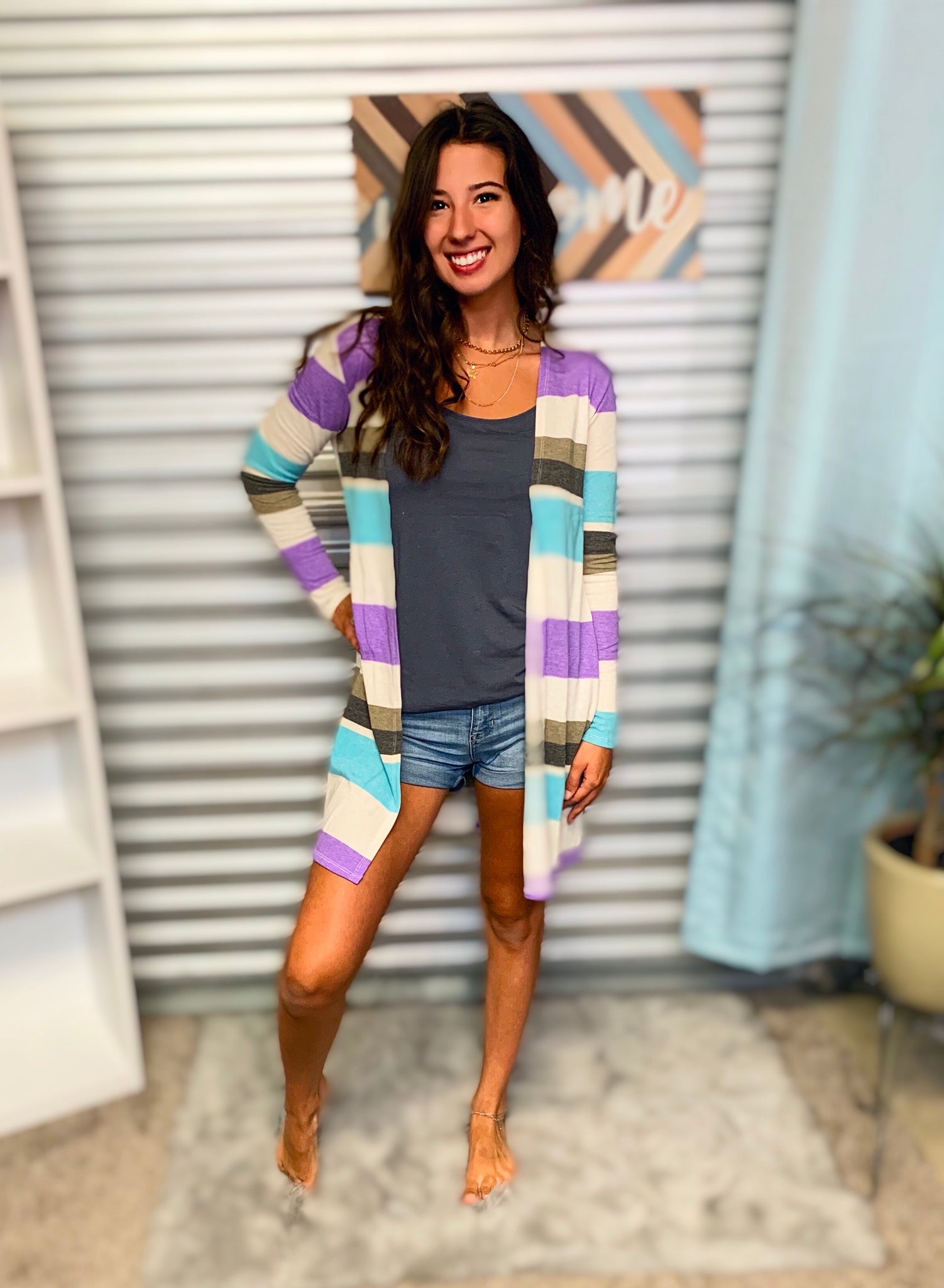 Lightweight beautiful striped purple and blue with brown, gray and cream cardigan. Perfect to throw on in the summer on a cool night or for an air conditioned office.