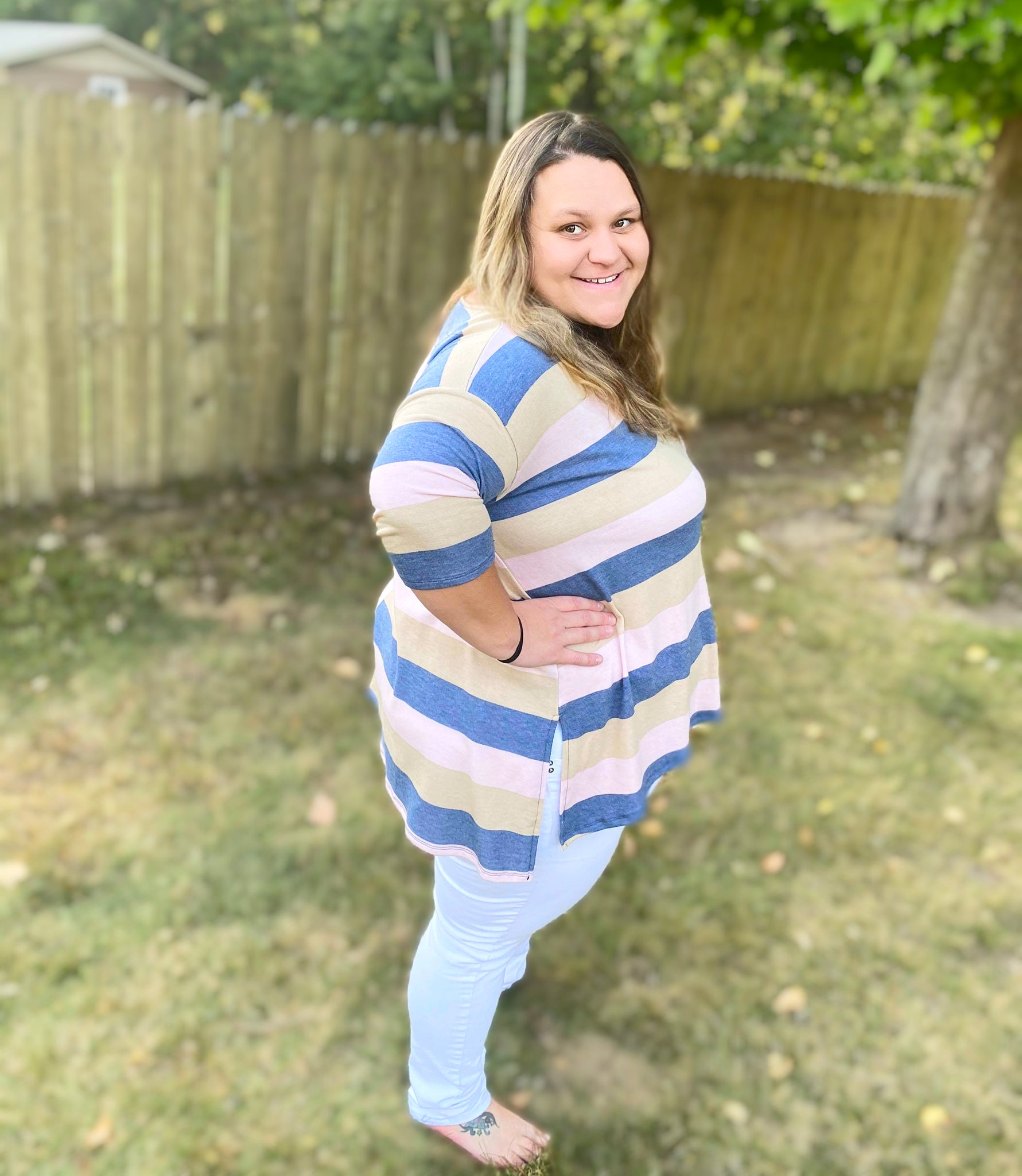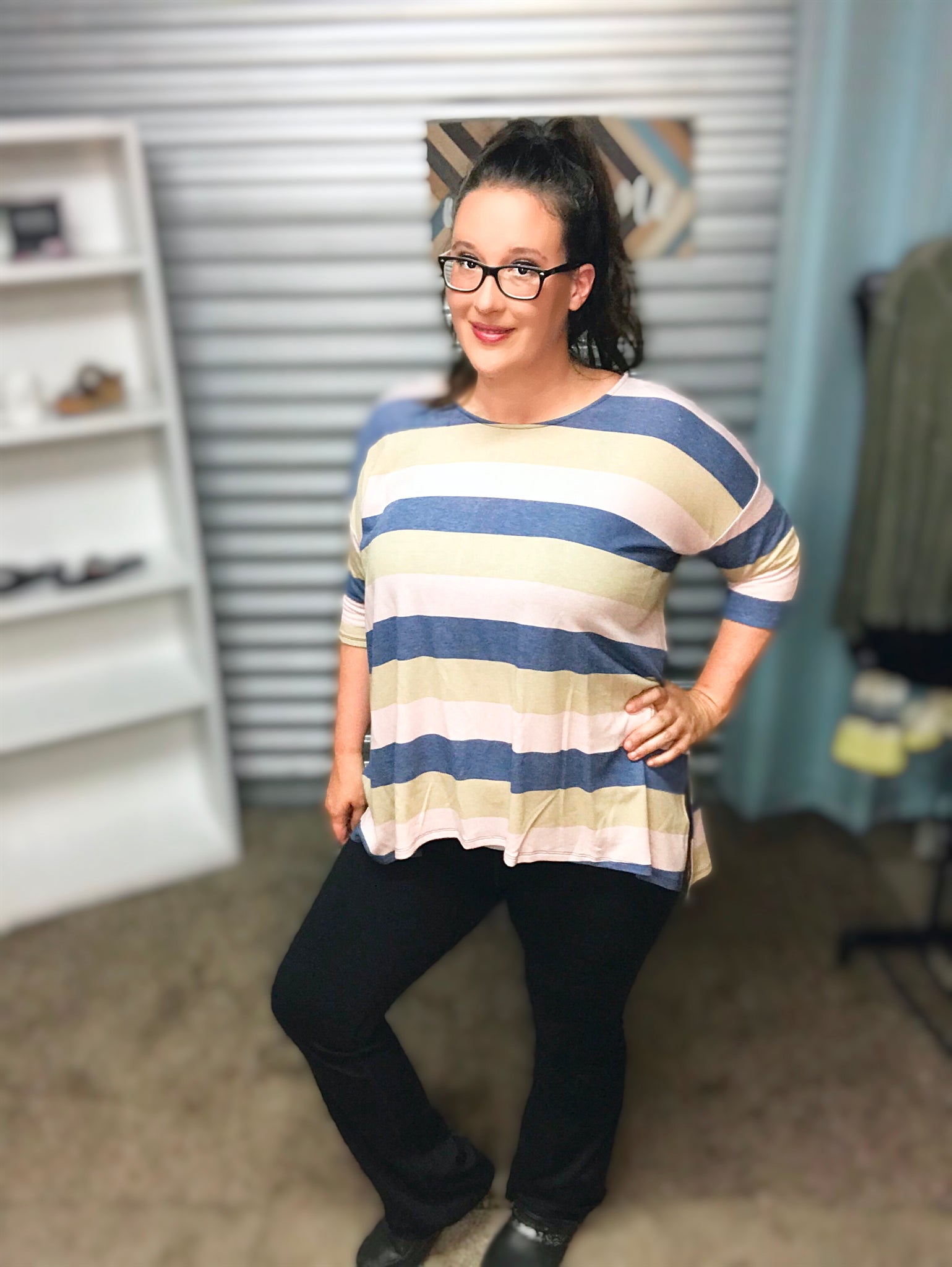Honeyme  navy/beige/blush drop sleeve striped top is ABSOLUTELY perfect for fall transition. Throw on a cardigan or jacket and your good to go! This comes in group sizing and L/XL will fit up to a 2XL.