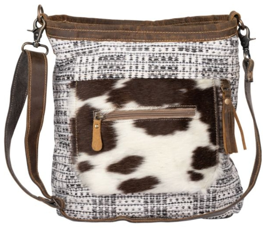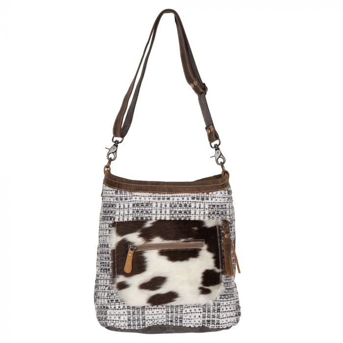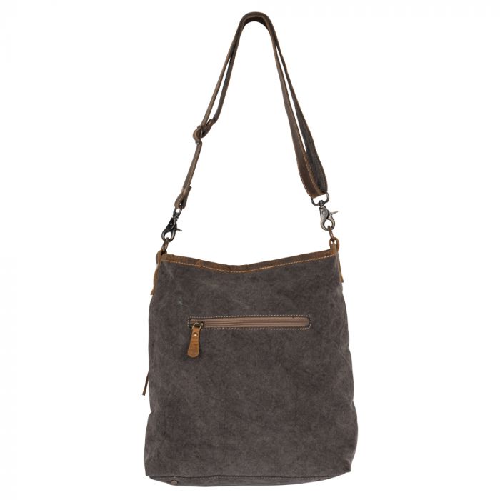 A sturdy, up-cycled canvas bag that will make you fall immediately in love with it's chic leather straps and beautiful rug designs. Secure your little things in its front hairon zipper pocket.
