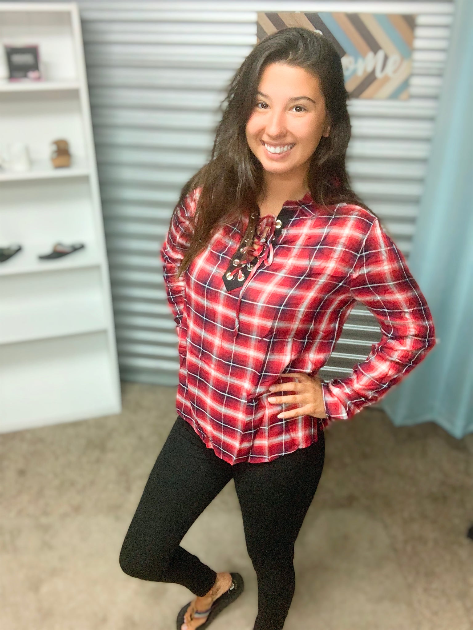 Get ready for fall with this adorable red plaid top. We are in LOVE with the laced up detailed neckline! Grab this one fast we have limited quantity!