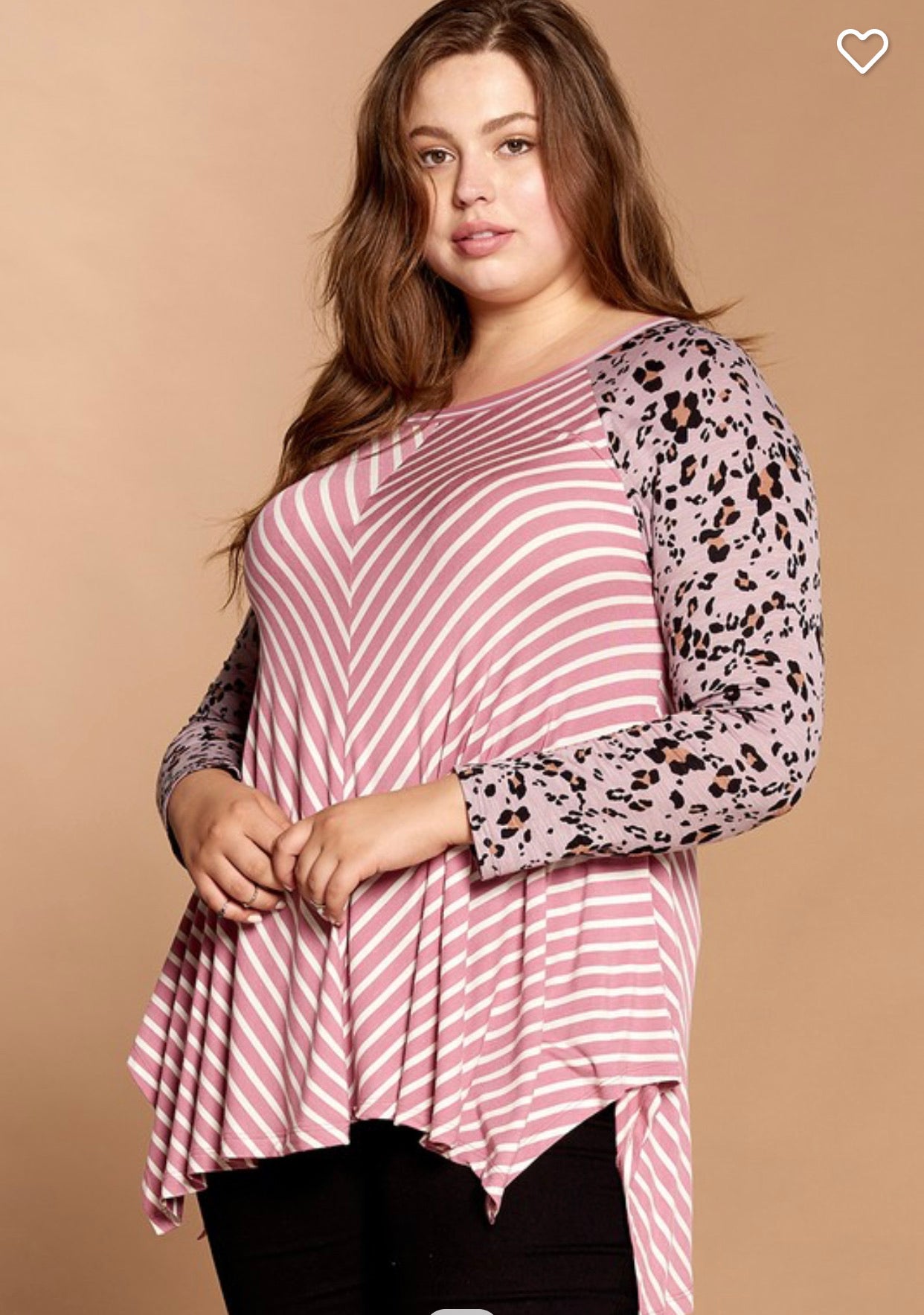This mauve colored top has Amazing stripes that create a SUPER slimming effect! The adorable cheetah print sleeves make this fun addition to your closet! Grab it up now! Quantity is limited!