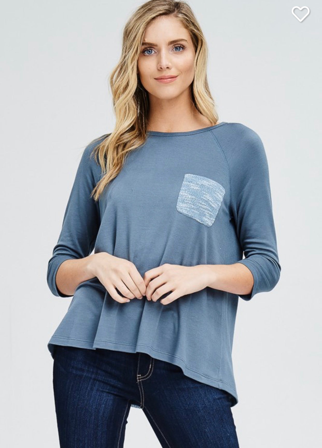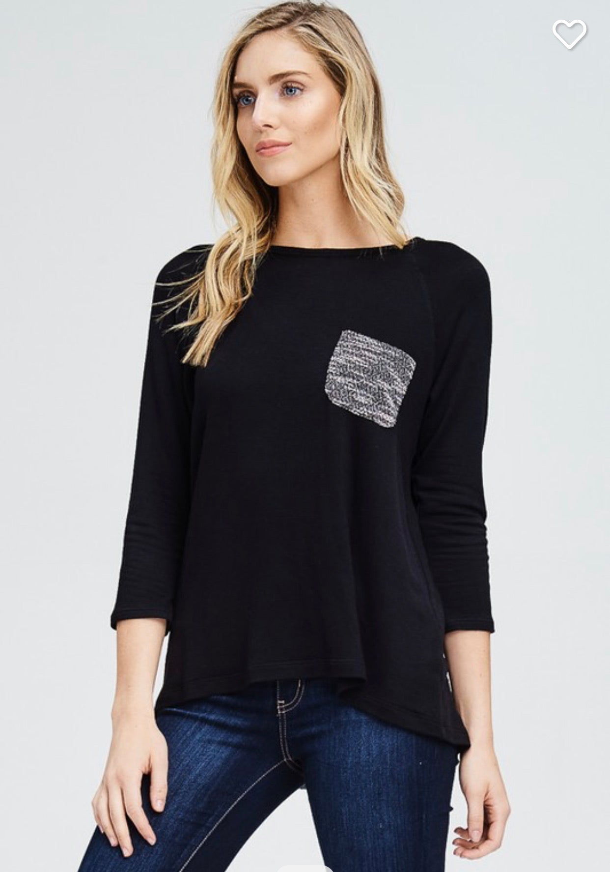 This cute little swing top is flowy in your true size. We love the raglan pocket detail and the back detail. The 3/4 length sleeve is perfect for fall. Hit that buy button fast!